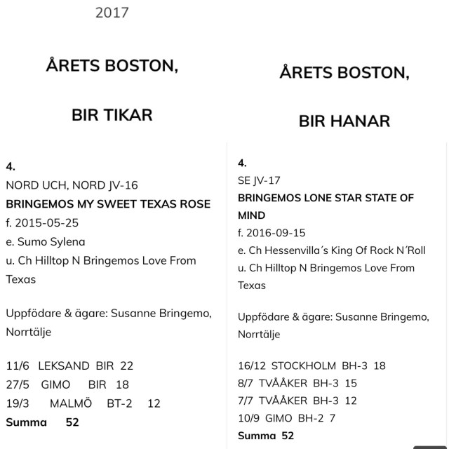 Vilken lycka att konstatera att vi fick fjärde bästa TIK OCH HANE på Svenska Bostonterrier Klubbens Årsbästa Lista för Utställningshundar 2017 🥂